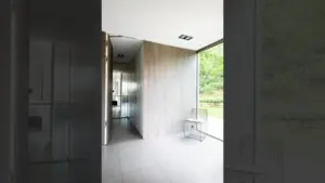 Gestalterisches Hauptelement ist eine über Eck laufende Wandverkleidung, die Garderobe, Gäste-Bad sowie eine Spiesekammer optisch integriert sowie das sich über 2 Geschosse erstreckende Bücherregal